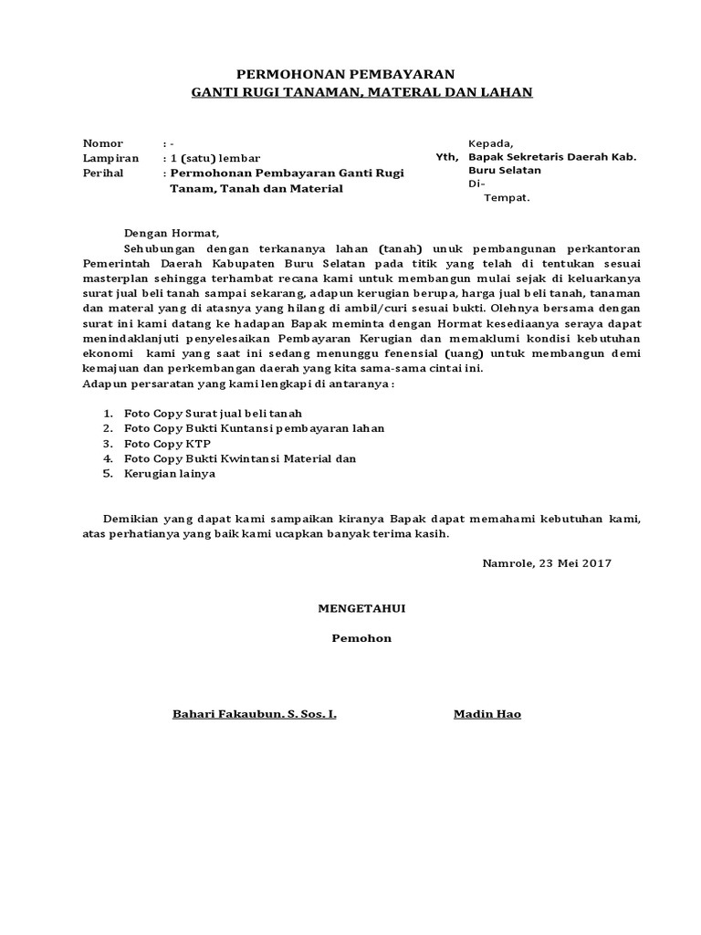 Contoh Surat Mohon Pembayaran Tanah